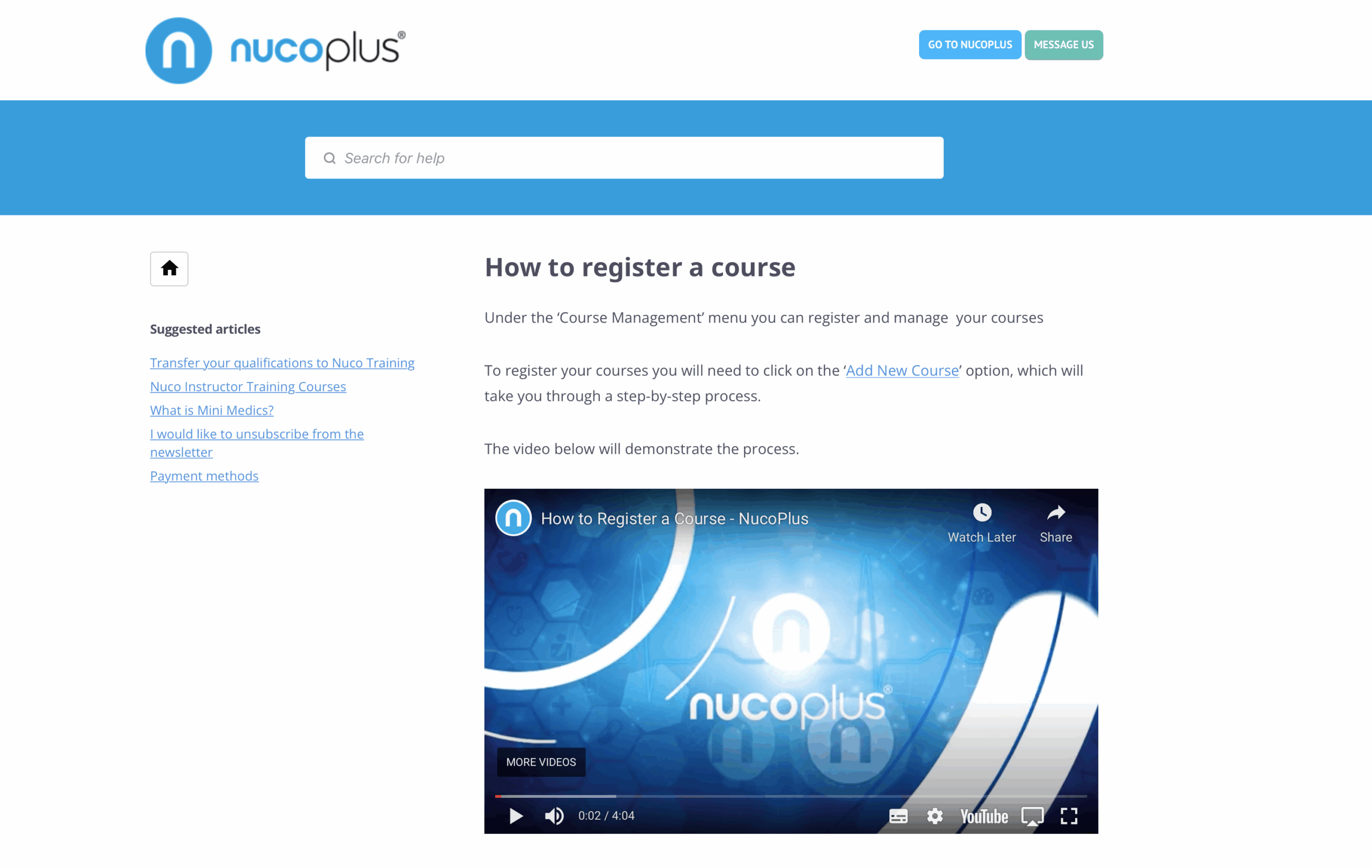When you are logged in to NucoPlus you can find everything you need by searching in the ‘Help Centre’ including how to register your courses and as this example shows, you can even find useful tutorial videos to guide you through the process.